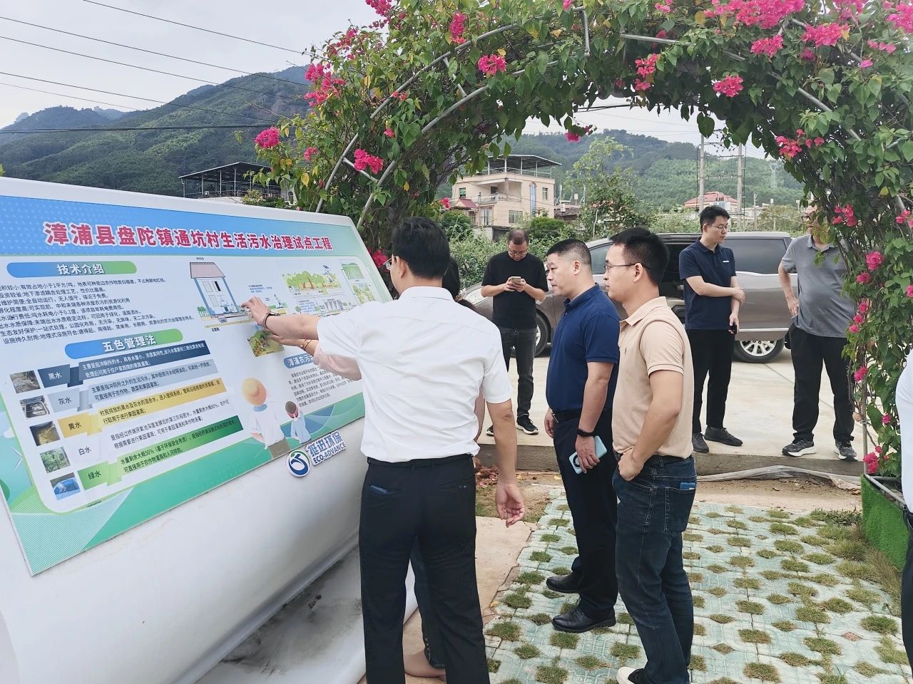 調研組深入現場,依次參觀了“101”管理模式下建設的管網、隔油池、太陽能自助便民利用井、便民利用井、末端達標處理設施、噴灌系統和在線監控檢測系統,贊揚了我司地下滲濾耦合技術在農污領域的使用優勢。