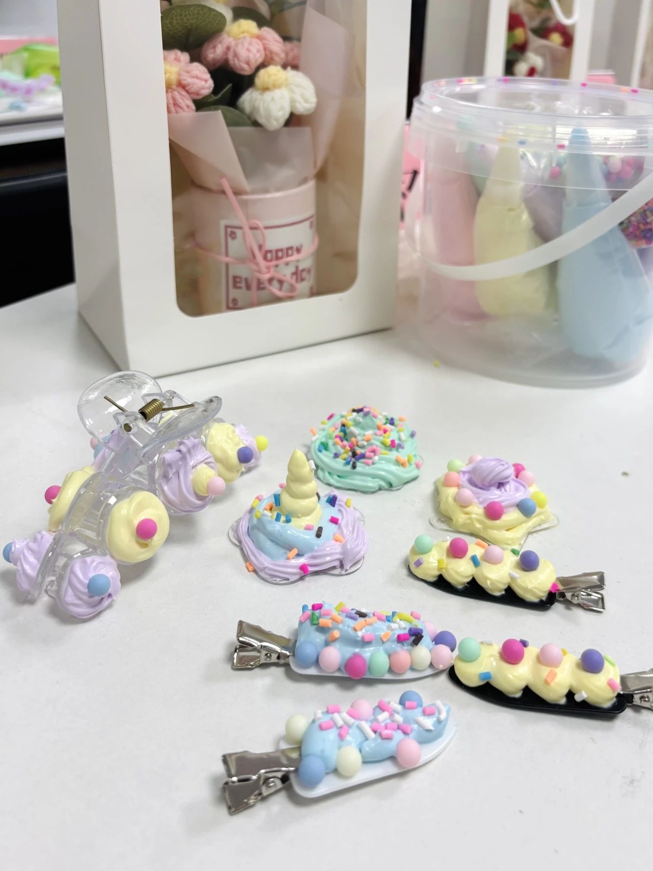 活動(dòng)現(xiàn)場(chǎng)化身為夢(mèng)幻手作樂(lè)園:挺進(jìn)總部會(huì)議室內(nèi)的長(zhǎng)桌上,堆滿(mǎn)糖果色奶油膠與裝飾等元素。大家從擠膠、塑形到點(diǎn)綴裝飾,全情投入創(chuàng)作——有人將發(fā)夾捏成甜甜圈的甜蜜形狀,也有人用星空元素打造銀河系耳畔的浪漫。挺進(jìn)的參與女性員工笑稱(chēng)這場(chǎng)活動(dòng)是"成年人的過(guò)家家"。
